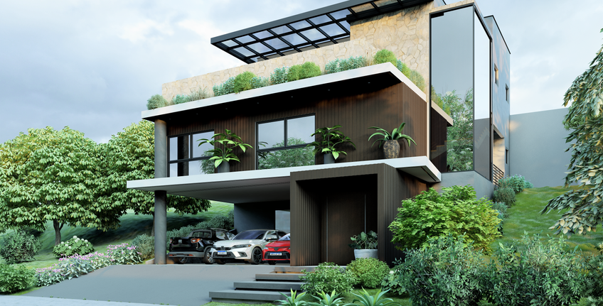 A criação dessa casa passou por referências enviadas pelo cliente, de onde tiramos elementos que o agradaram para implementar na planta que atende às necessidades específicas dessa família, mas mantendo também uma originalidade estética para que seja um projeto único.